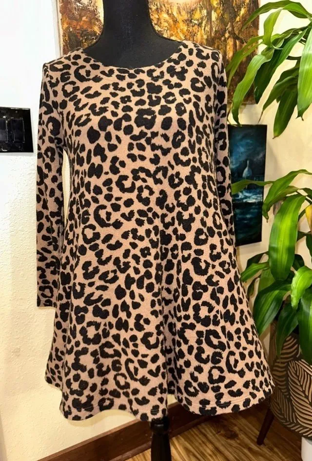 Excellent Used Condition Peach Love California Animal print mini babydoll dress with long sleeves. Size Medium Zipper back closure Sweater knit fabric #peachlovecalifornia #animalprint #babydolldress #longsleeves