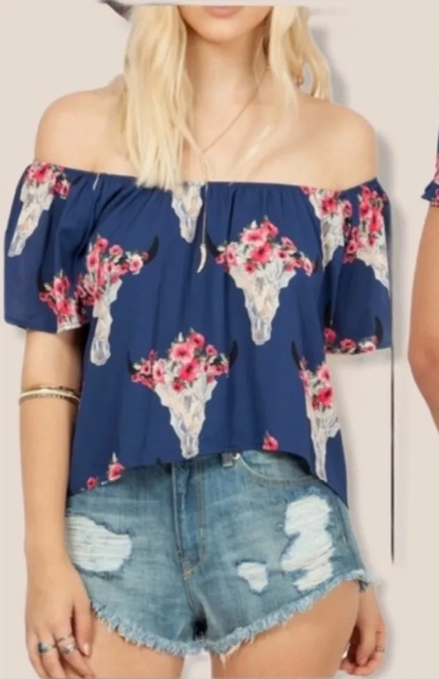 Such a beautiful set! By PEACH LOVE California Flowy navy printed off the shoulder top. Gorgeous Desert Skull print and flower crown. Can also be worn over shoulders! Unique Navy Desert Skull printed flowy ruffle shorts. Elastic waist makes for an easy fit. Ruffle bottoms with interior liner (See Pic) So many options with this set!! Pair top with denim shorts, or wear shorts with another beautiful top for another look! Great condition No flaws * smoke & pet free *fast shipping Stock photo is for fitting preference M790