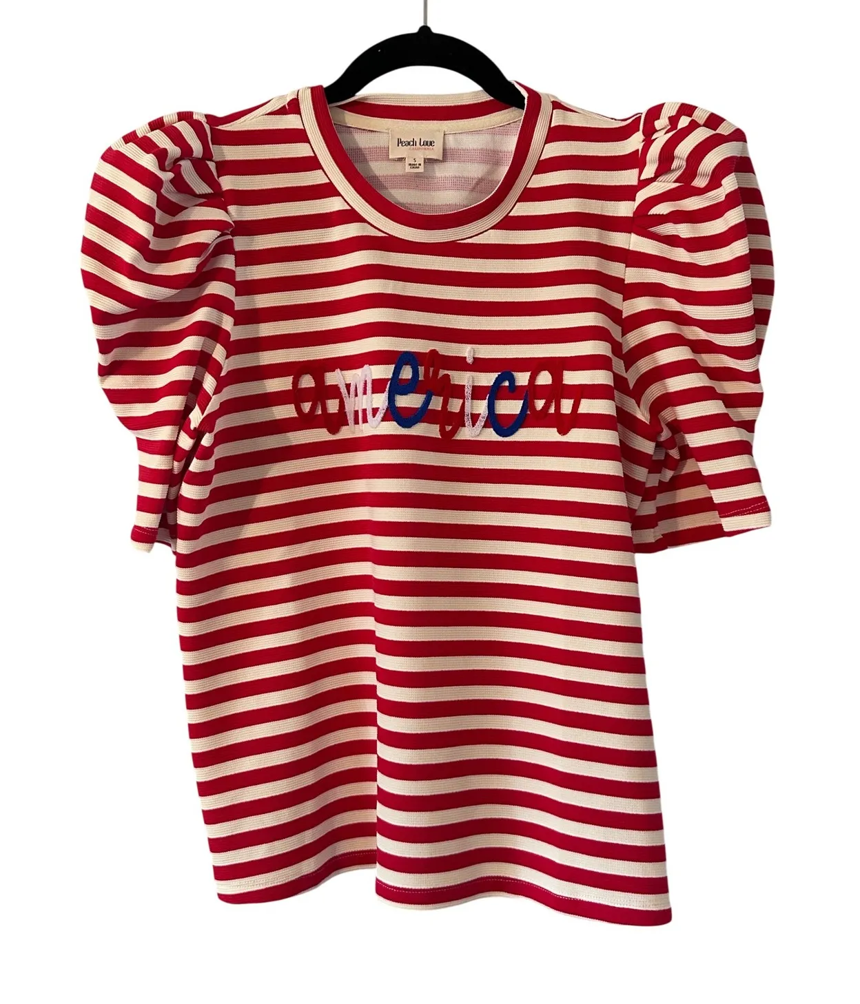 Peach Love California red and white striped t-shirt top. Features bold embroidered "america" text in red white and blue with contrasting puff sleeves. A fun and festive top perfect for Fourth of July celebrations or casual summer wear. No stains or holes. Measurements: • Shoulder to Shoulder: 14 in • Bust: 17 in • Length: 23 in • Sleeve Length: 8 in Type: T-Shirt Department: Women Style: Basic Material: Cotton, Polyester, Spandex Neckline: Crew Neck Sleeve Length: Short Sleeve Sleeve Type: Puff Sleeve Pattern: Striped Accents: Embroidered Theme: USA Fit: Regular Fabric Type: Knit Occasion: Casual Closure: Pullover Season: Summer, Spring Keywords: striped tee, puff sleeves, embroidered, patriotic, July 4th, summer casual, crew neck, knit top, statement sleeves, American pride, festive apparel, casual chic