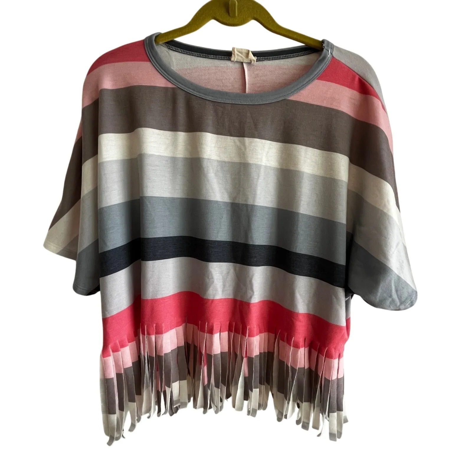 Breezy sophistication arrives in this charming striped tee. Cascading fringe dances along the hem, adding a playful touch to the boxy, relaxed silhouette. The dolman sleeves create an effortless, modern feel, while the soft knit fabric ensures all-day comfort. Dress it down with denim for a casual weekend look, or pair it with tailored trousers for a chic, bohemian vibe. This top is perfect for brunch with friends, a casual date night, or a relaxed day of shopping. Keywords: Peach Love California, striped top, fringe top, dolman sleeve, boxy top, casual top, bohemian style, knit top, t-shirt, womens top, short sleeve, round neck Thanks for Looking!