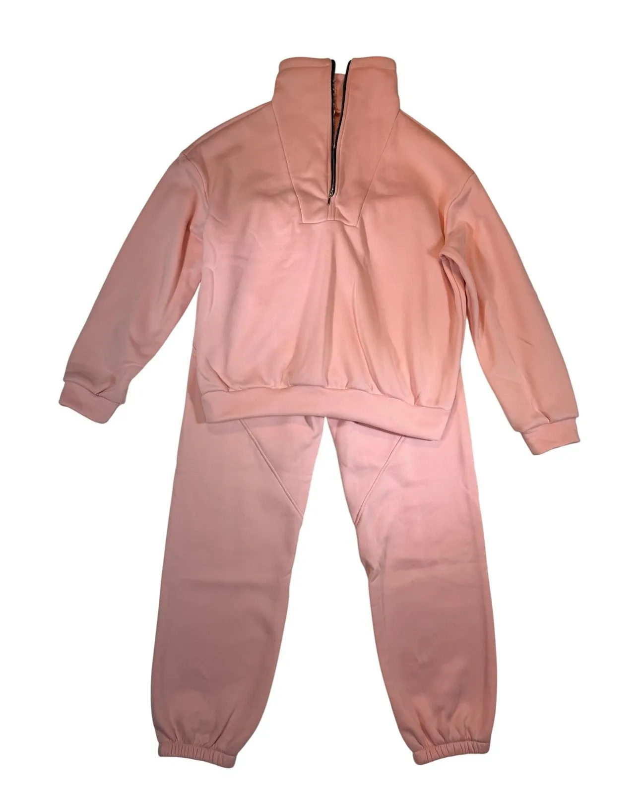 Women's two-piece loungewear set in a soft peach pink hue. This cozy ensemble features a quarter-zip pullover sweatshirt with a stand-up collar and matching jogger pants with elasticized cuffs and waistband. The relaxed fit and plush fabric make this set perfect for a day of errands, a casual hangout with friends, or relaxing at home. Measurements: • Sweatshirt Bust: 25 in • Sweatshirt Length: 23 in • Sweatshirt Sleeve Length: 22 in • Pants Waist: 14 in • Pants Inseam: 28 in • Pants Outseam: 40 in Department: Unisex Adults Type: Tracksuit Style: Sweatsuit Fabric Type: Fleece Set Includes: Pants, Sweatshirt Performance/Activity: Gym & Training, Running & Jogging Number of Pieces: 2 Piece Theme: Athleisure Material: Polyester Pattern: Solid Occasion: Casual, Activewear Features: Pockets Sleeve Length: Long Sleeve Keywords: loungewear, sweatsuit, fleece, quarter zip, joggers, peach, pink, cozy, athleisure, casual, winter, fall, comfort