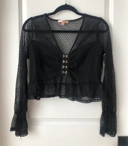 NWOT Black long sleeve crop ✰ sheer top with opaque chest area ✰ features “hook and eye” details down the front ✰ bubble sleeves with frill/flare at the wrists ✰ sold out online! ✰ tagged as size Large but I’m a Medium/Small and it fits me well ✰ bought from a boutique ✰ comment with any questions!