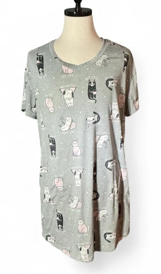 A charming grey sleep shirt nightgown for women featuring a playful all-over print of Snoopy and Woodstock cats. This comfortable and casual piece showcases various cat poses with adorable phrases like "feline good" and "cat naps." The v-neckline and short sleeves offer a relaxed fit, perfect for lounging at home or enjoying a cozy night's sleep. Ideal for relaxing evenings, weekend mornings, or as a sweet gift for cat lovers. Keywords: sleepshirt, nightshirt, loungewear, pajamas, cat lover, snoopy, woodstock, graphic print, casual, cozy, sleepwear, comfy, gift All clothing are cross posted, #Maximalism #Bohemian