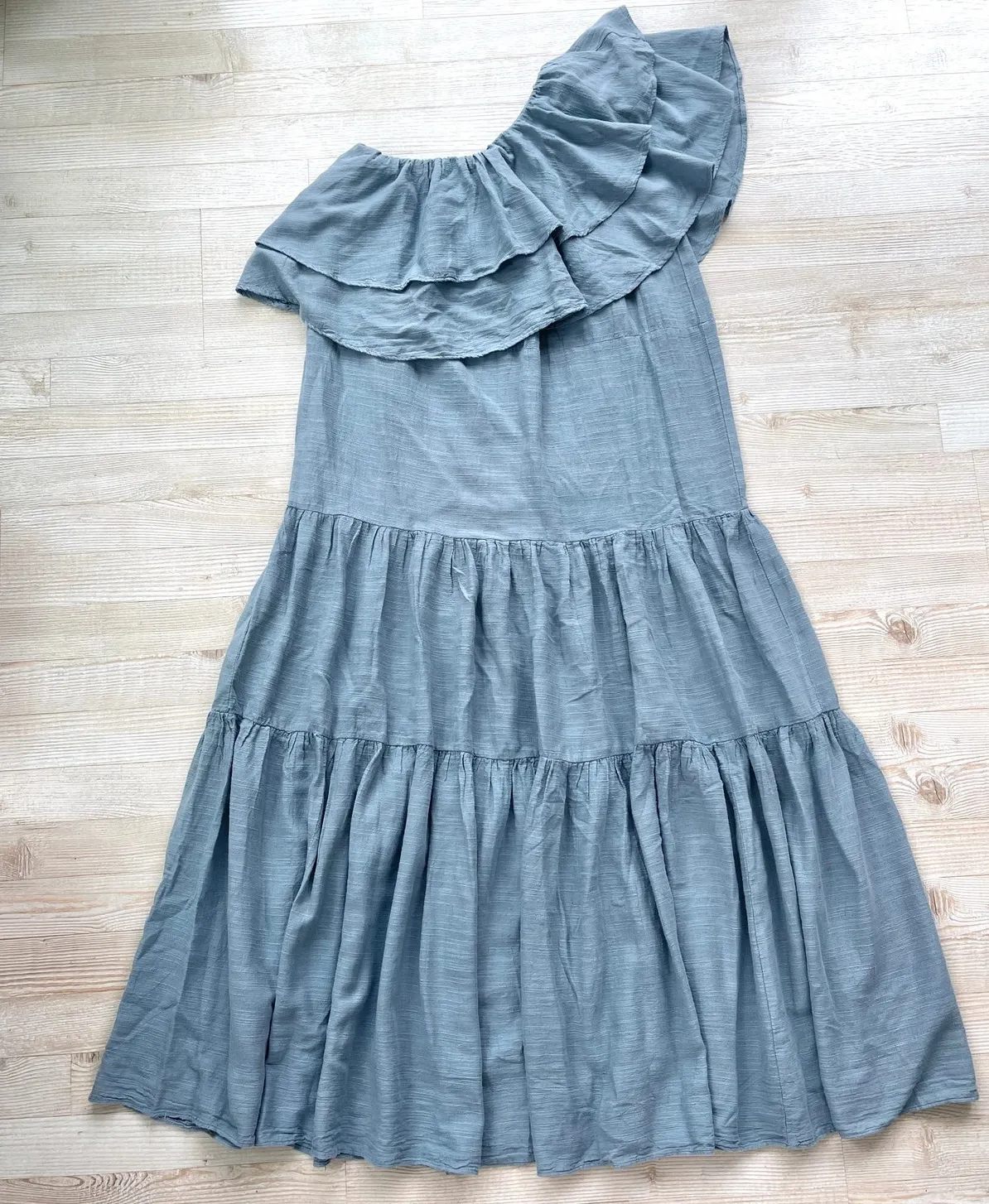 In great condition but missing belt! The Pearl & Caviar One Shoulder Maxi Dress is an essential piece this summer. Made from a cosy linen mix to keep you feeling breezy, this dress features a fabulous single shoulder with neckline ruffles. Complete with a tiered maxi skirt to guarantee a relaxed fit, this piece would pair well with espadrilles. Relaxed fit Tiered dress Maxi length 30% Linen, 40% Cotton, 30% Tencel Hand wash only Laid flat chest and length measurements shown