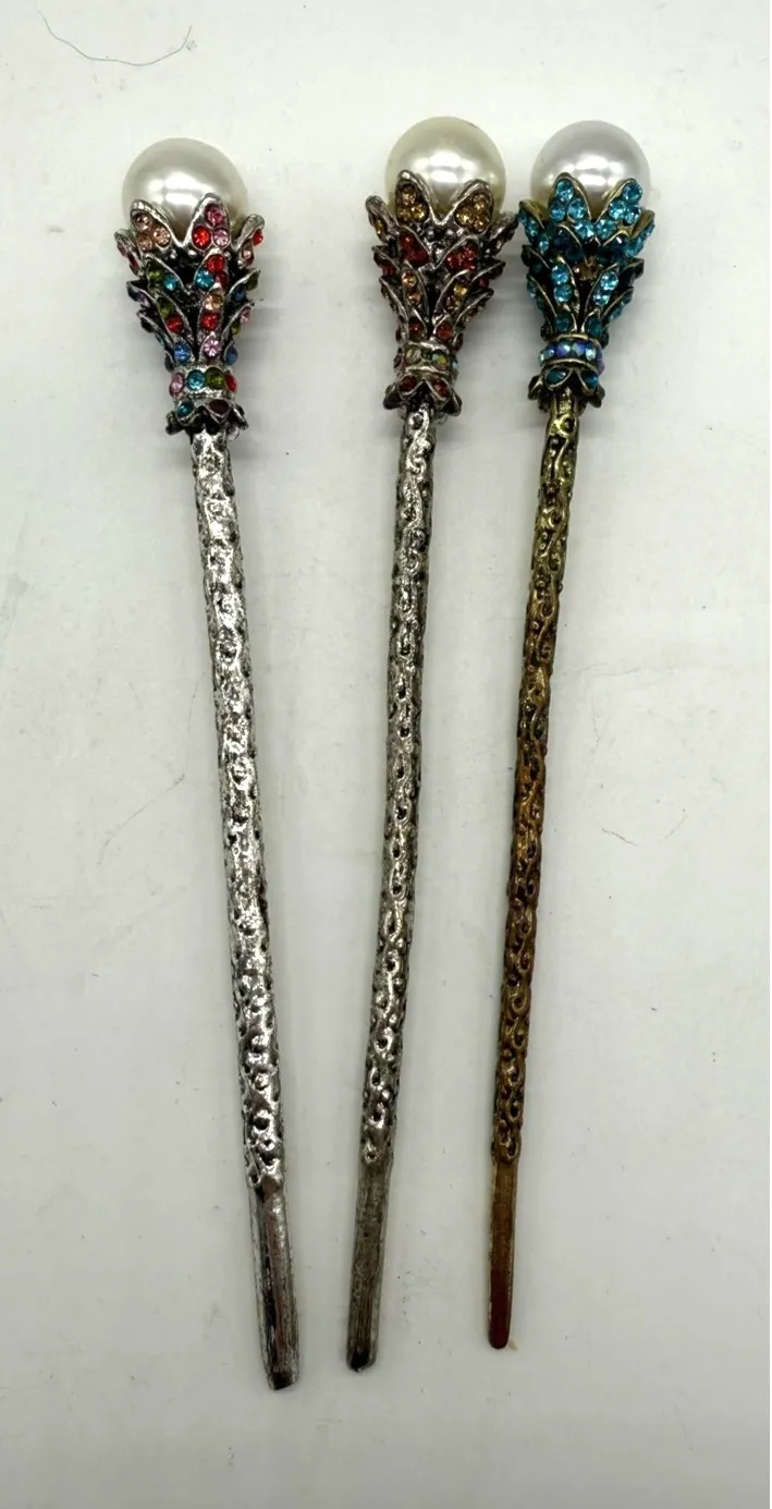 Decorative metal hair sticks set for styling buns or updos; includes three coordinating pieces with faux pearl tops. Condition: Pre-owned set with tarnishing and surface wear on metal shafts and tips. Faux pearls and rhinestones intact. Color: Multicolor design with silver-tone and bronze-tone metal, white faux pearls, and colorful rhinestone accents. Material: Textured cast metal shafts with ornate leaf motif settings, faux pearl beads, and faceted glass rhinestones. Department: Suitable for teens and women; designed for use with all hair types. Details: Intricate scrollwork along shafts, rounded tips, clustered rhinestones surrounding each pearl, elegant accessory for formal events, costumes, or everyday decorative hairstyles.