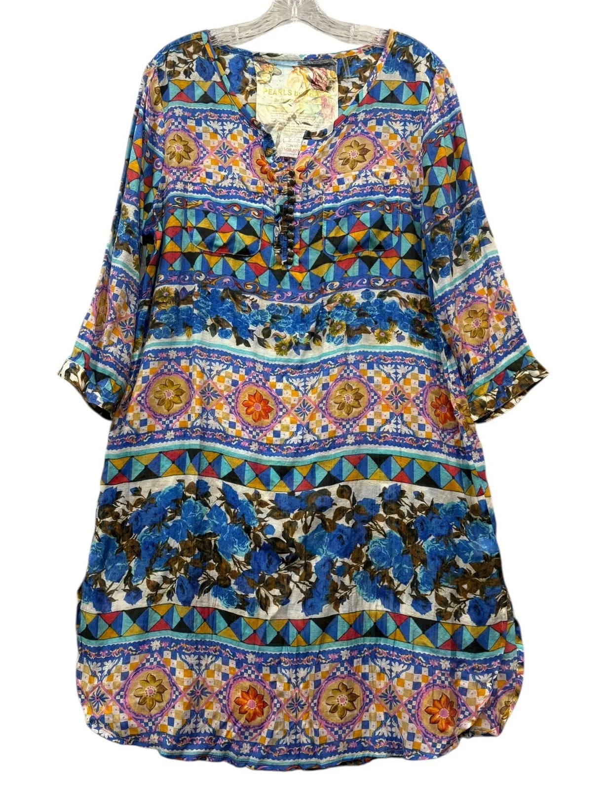 Pearls By Aratta Los Angeles Boho floral print v-neck tunic dress. Gently Used This vibrant piece showcases a unique medley of geometric patterns and blooming florals in a striking color palette. The relaxed silhouette features a flattering V-neckline with a delicate button closure and ruffled trim. Three-quarter length sleeves and a curved hem add to its effortless charm. The back offers a continuation of the intricate print, creating a cohesive and eye-catching design. Lightweight. Size XL Approximate Measurements: 39" Length 22" Pit To Pit 19" Sleeve Length Boho, Floral, Festival, Colorful, Vintage-Inspired, Flowy, Printed, Statement, Relaxed, Ethnic Feel Free To Ask Questions Or Request More Photos! SKU: 0274