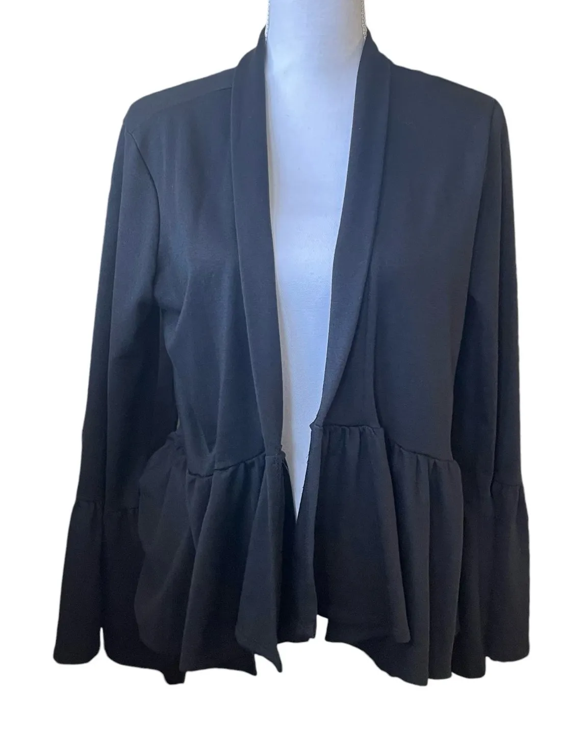 Pebble & Stone Women Cardigan M Black Open Front Peplum Hem Whimsigoth Cottage Well cared for condition - no flaws noticed Features:: (First picture truest color) -mid weight -lapel neck -long bell sleeve -some stretch -relaxed silhouette -polyester rayon spandex blend, machine wash Style Profile: comfortable, easy care, packable, feminine, versatile, stylish, work, office, weekend, vacation, travel, school, church, minimalistic, neutral, boho Approximate Measurements: flat lay: armpit to armpit: 21“ length: 22“ Pet/smoke free home 1-2 day shipping Bundle & Save