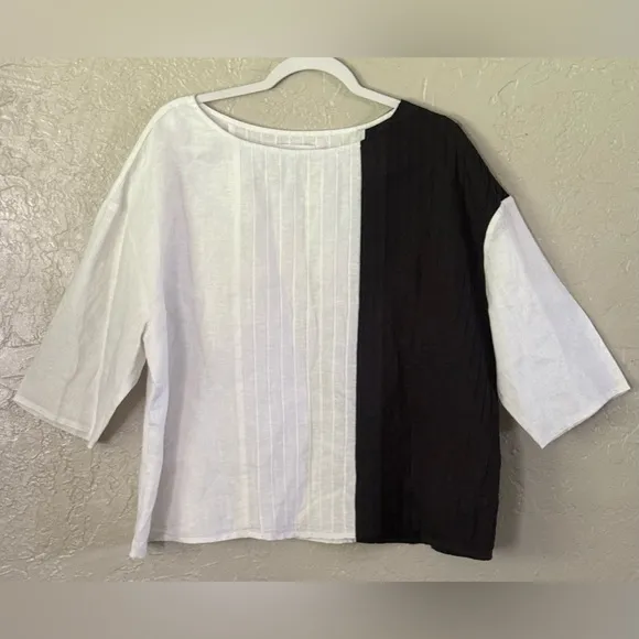 The Peck & Peck Linen Top Blouse in XL features a stylish color block design with pintuck pleats for a boxy fit. Made from breathable linen fabric, this blouse is perfect for travel, casual, or business occasions. The 3/4 sleeve and round neckline provide a comfortable and relaxed fit, while the pullover closure makes it easy to wear. The white and black color combination and pleated accents add a colorful and stylish touch to this basic yet chic piece. Ideal for summer, fall, and spring, this blouse is a versatile addition to any woman's wardrobe. Condition: Excellent!! Please feel free to view my full inventory. Thank you!