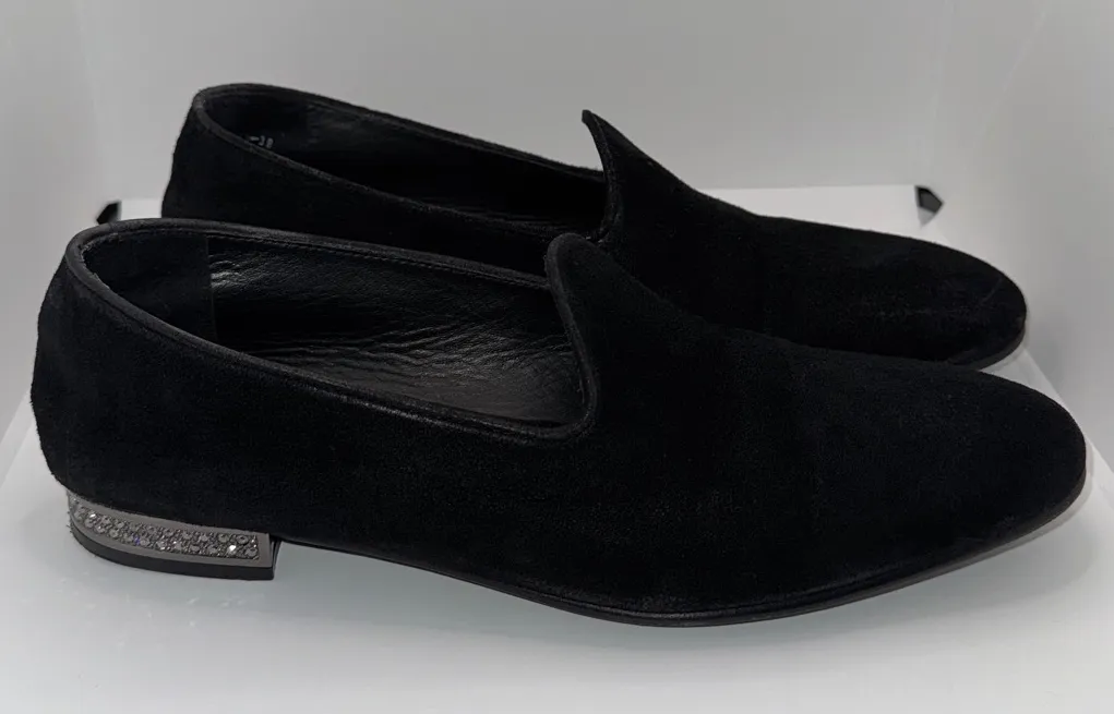 . Suede leather upper, slip on loafer, round toe, low 1” square heel encrusted with Swarovski crysta... Show more