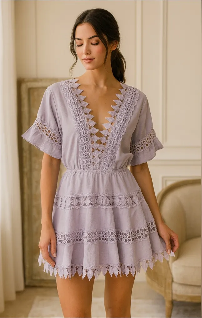 Gorgeous Peixoto “Ora” Dress in a soft dusty lavender hue. This beautiful piece features intricate eyelet and lace trim detailing, a deep V-neckline, flutter sleeves, and a tiered mini skirt for a romantic, feminine silhouette. Made from lightweight 100% cotton with a rayon lining for comfort and breathability. Perfect for spring and summer, vacation wear, or resort weekends. Effortless pullover style, partially lined, and made in Colombia. Details: • Brand: Peixoto • Style: Ora Dress • Color: Dusty Lavender / Lilac/ purple • Material: 100% Cotton (Body) / 100% Rayon (Lining) • Size: Small • Features: Eyelet + lace trim, V-neck, flutter sleeves, tiered mini skirt, partially lined, pullover • Condition: Excellent preowned condition • Originally $218 retail Approximate Flat Measurements: Pit to pit: 19” Length: 30” Peixoto Ora Dress, Peixoto lavender dress, lilac eyelet mini dress, lace trim summer dress, resort wear, beach vacation dress, boho chic mini dress, feminine ruffle sleeve dress, cotton lace dress, spring outfit, Peixoto small dress, lavender tiered dress, dusty lilac eyelet mini, coastal chic style, wedding guest casual dress