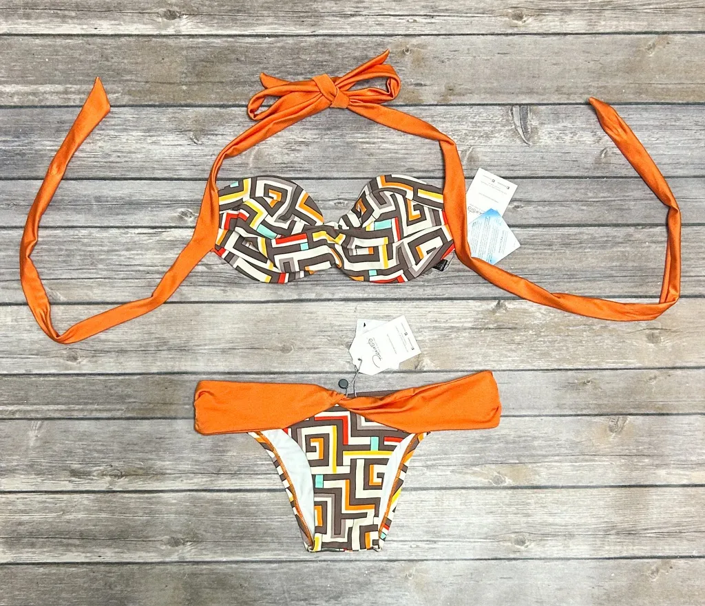 Swimwear Brand: Peixoto Size: XS (**please see photos for approximate measurements as this is a Colombian brand and is different from US sizing**) Style: “Via Linda” geometric print bikini in cream, black, orange, red, gray, taupe, yellow and turquoise blue. Halter tie neckline and back tie closure. Underwire cups with padding. Hipster bottoms are fully lined. Hand wash garment care. Condition: New with tags. Comes from a smoke free home. Please feel free to ask any questions before purchase. I typically ship within 24 hours but please be advised that I don’t ship on Saturdays or Sundays. Thank you for understanding!
