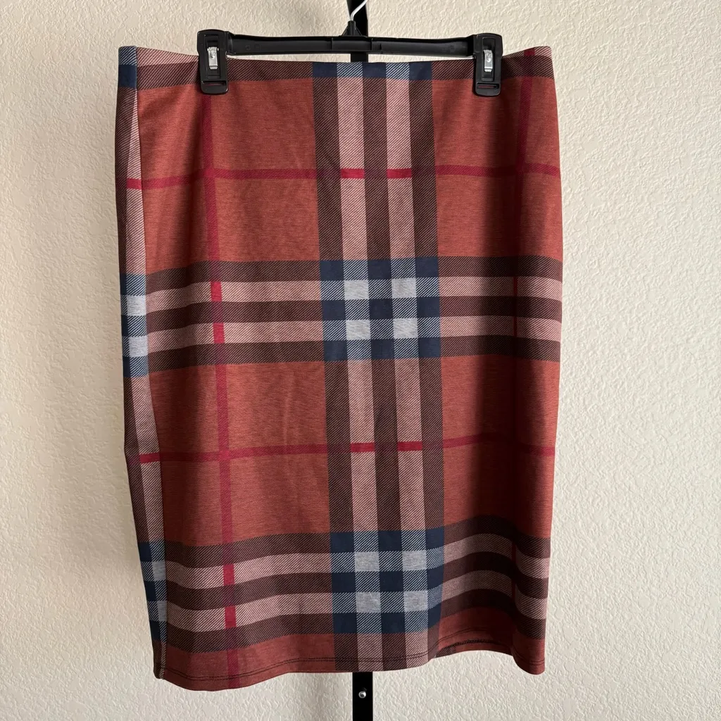 Plaid Academia Skirt NYCC Rust Red Plaid Pencil Skirt Women’s Size Large Stretch School Prep Look structured preppy plaid mod classic chic autumn tones academia inspired schoolgirl look brunch outfit Brand: NYCC New York Clothing Co Size: Large Color: Rust Red / Navy / Taupe / Gray Material: 64% Polyester / 30% Rayon / 6% Spandex • Stretch pencil silhouette with fitted shape • Rust and navy plaid with taupe stripe contrast • Pull on style with hidden elastic waistband • Midweight knit with smooth structured texture • Office to casual transition piece Measurements: Waist: 18” relaxed, 21” stretched Full Length: 25” Condition: New without tags. Clean, with no flaws or damage. Packaged with care. Ships same or next day. Offers welcome. Bundle and save! ladybugthreads P76R2 rust plaid skirt preppy pencil skirt academia outfit plaid workwear teacher style fall fashion staple school uniform look retro plaid pattern stretchy office skirt cottage academia aesthetic vintage mod skirt cozy fall outfit