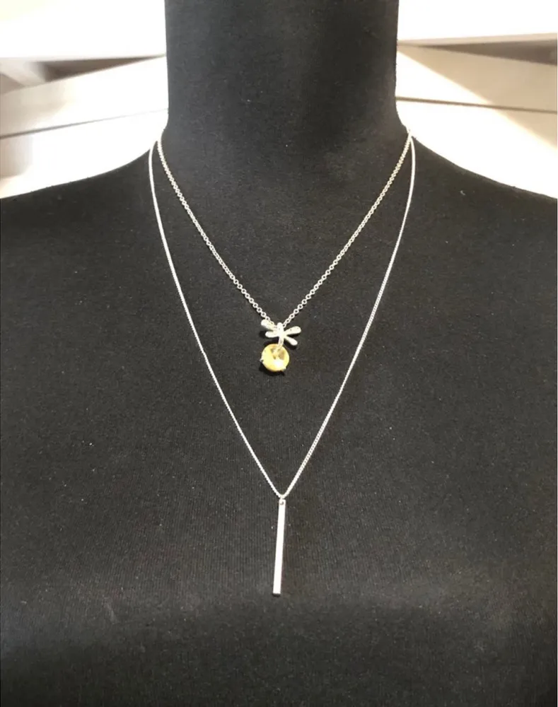 Women's pendant necklace set with bar and dragonfly charms. Features yellow glass gem layered jewelry. New without tags. Ships fast from a smoke and pet-free home. #necklace #pendant #jewelry #dragonfly
