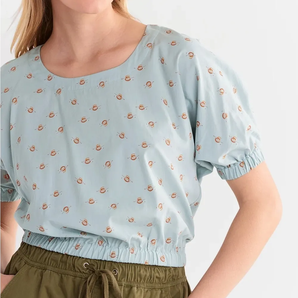 Bring soft, feminine charm to your wardrobe with this Pendleton sky blue cropped blouse, detailed wi... Show more