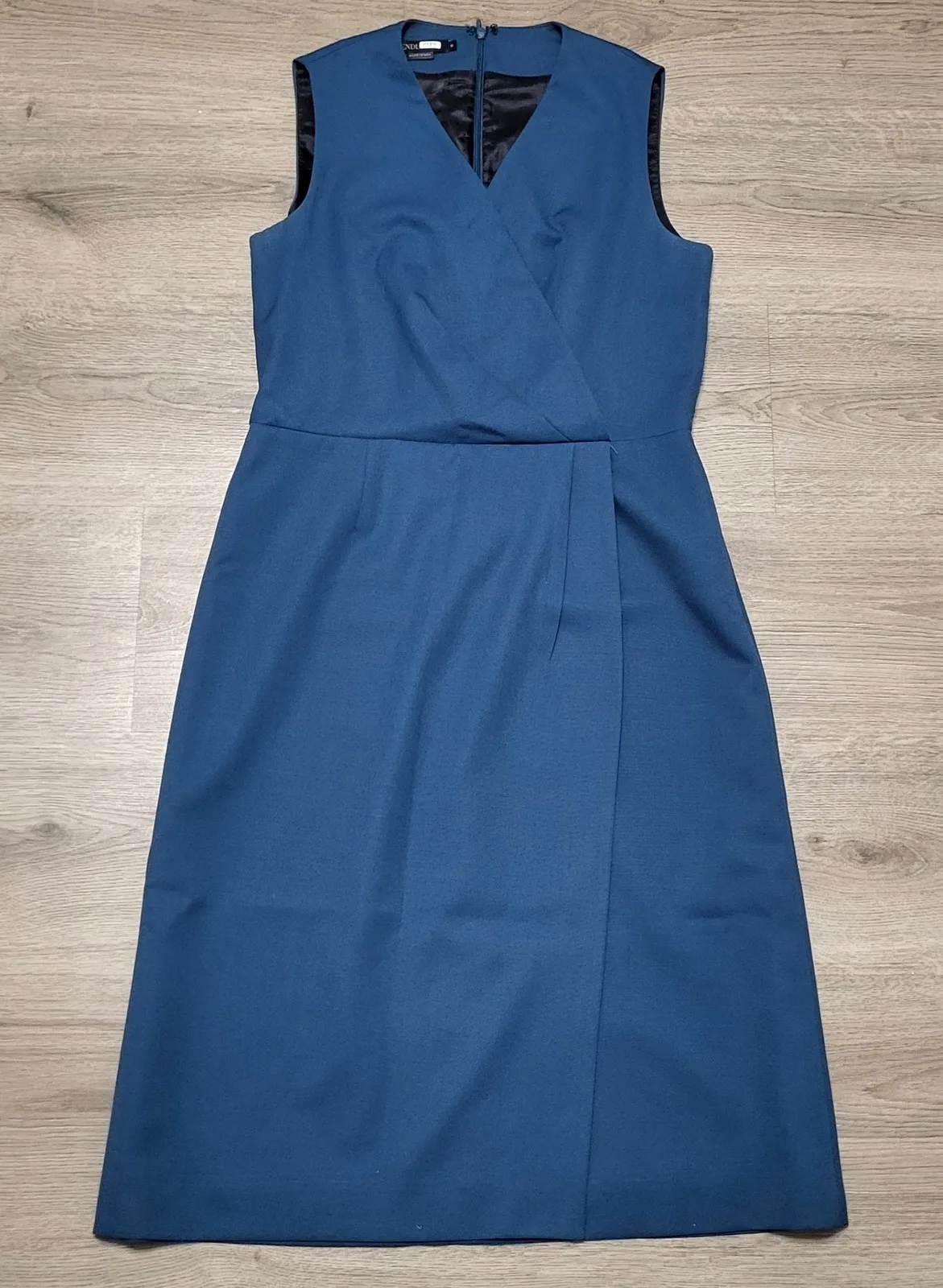 Virgin wool Pendleton faux wrap dress in a rich teal blue hue women's size 6. This sleeveless dress features a flattering V-neckline and a classic knee-length silhouette with a sophisticated wrap detail at the skirt. Its tailored design makes it perfect for professional settings or elegant evening events. Keywords: Pendleton, sheath dress, wrap dress, blue dress, sleeveless dress, professional attire, business casual, workwear, elegant, tailored, knee-length, classic Pre-owned in good condition with plenty of life left see all photos for condition, signs of wear and measurements. If unsure about size, please compare measurements to similar item you already own. As with all pre-owned items please expect minor signs of wear.