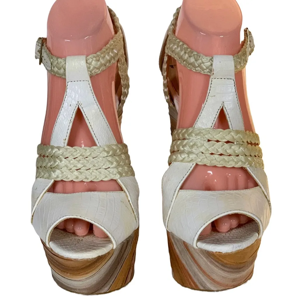 This listing is for the shoes pictured. Penny Loved Kenny -white/off white -faux leather -braided rope accents -wrapped brown neutrals wedge heel -platform -buckle closure -synthetic sole Shoes are a size 7.5 (6 inch heel) -additional measurements are provided in photos. Preowned -some discoloration to white portions (yellowing); marks to shoe exterior and wedges Refer to photos. *all preowned footwear will have general signs of use. These signs include: wear to bottom soles in the form of scuffing and scratching, markings to interior sole lining and general wrinkling to exterior materials. If there are any damages which exceed these typical, overall, flaws, they will be noted in the description. No items will retain their original packing or additional accessories unless otherwise noted in the description.