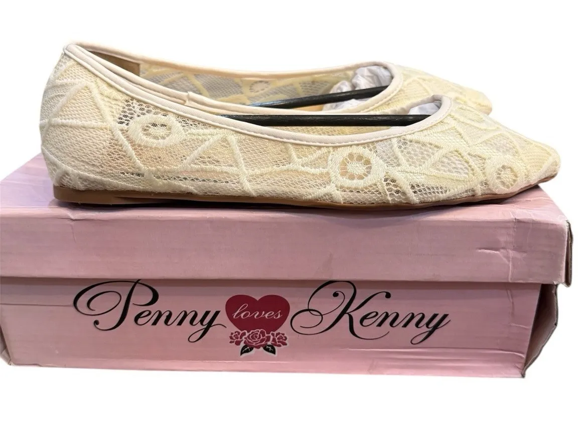 The product is a pair of Penny Loves Kenny Knot Lace Ballet Flats in white/ivory, with an embroidered fairy design. These size 8 flats are perfect for women looking for a stylish and whimsical shoe option. The lace fabric and ballet style add a touch of elegance to any outfit, while the embroidered accents give the shoes a charming and unique detail. Perfect for those who love fantasy and fairy-inspired designs in their footwear. 2226