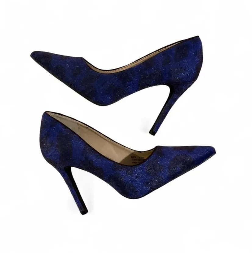 Penny Loves Kenny blue sparkle textile pointed toe stiletto heel pumps. These elegant heels feature a striking blue hue with a subtle shimmer, adding a touch of glamour to any outfit. The pointed toe and classic stiletto heel create a sophisticated silhouette, perfect for elevating your look. The comfortable textile upper and synthetic lining ensure a pleasant wearing experience. Style: Pump Department: Women Upper Material: Textile Heel Style: Stiletto Theme: Clubwear Type: Heel Toe Shape: Pointed Toe Pattern: Flecked Heel Height: Ultra High (4 in & Higher) Closure: Slip On Keywords: Penny Loves Kenny heels, women's blue pumps, sparkle stiletto heels, pointed toe heels, dress shoes, evening shoes, party heels, fashion pumps, designer heels, celebrity style heels, glamorous shoes, metallic heels, textile pumps, designer footwear