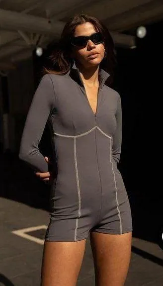 Size US 6. Long sleeve, charcoal colored, zip-up romper. Incredibly comfortable. Definitely a little on the cheekier side (see images). Great condition! Romper, playsuit, jumpsuit