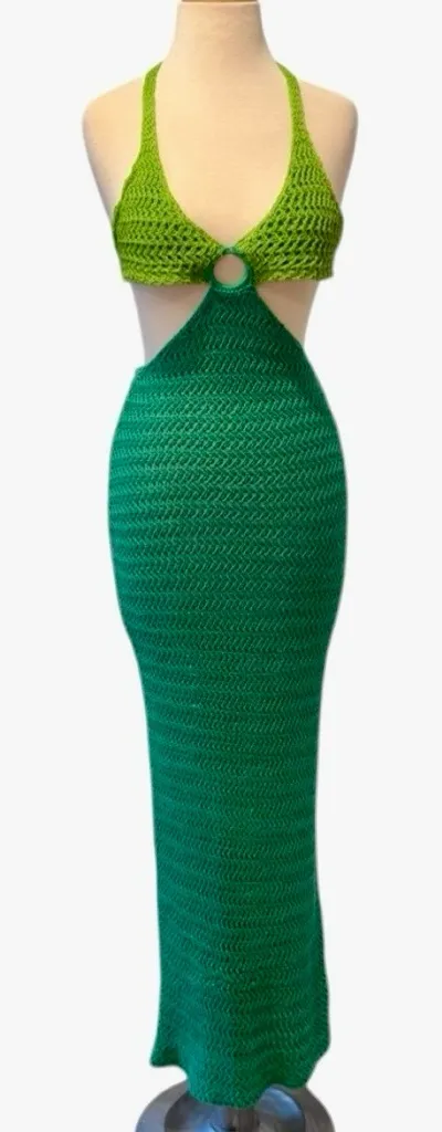 • Crochet knit maxi dress with halter neck and back ties for an adjustable fit. • Center O-ring detail connecting the bodice and skirt with side cut-outs. • Two-tone green palette combines a lime green halter-style top with a rich emerald green skirt • Lined top • Excellent preowned condition with some minor signs of gentle wear on the fibers. No pulls, damage or flaws. Please see pictures for measurements. Fabric is very stretchy (skirt can stretch to 22”) Mailed next business day 🌸 Keywords: Peppermayo, Peppermayo Exclusive, crochet dress, maxi dress, cut-out dress, green, lime green, emerald green, two-tone, colorblock, halter neck, O-ring detail, festival wear, vacation dress, beach coverup, summer dress, boho, bohemian, knit dress, backless, mermaidcore, tropical, spring break, party dress, 70s style, retro, resort wear, tropical, summer dress, beach