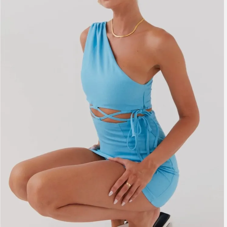 Peppermayo Memini One Shoulder Linen Mini Dress Blue Cutout Tie Party size 2 - $26 - From Audrey