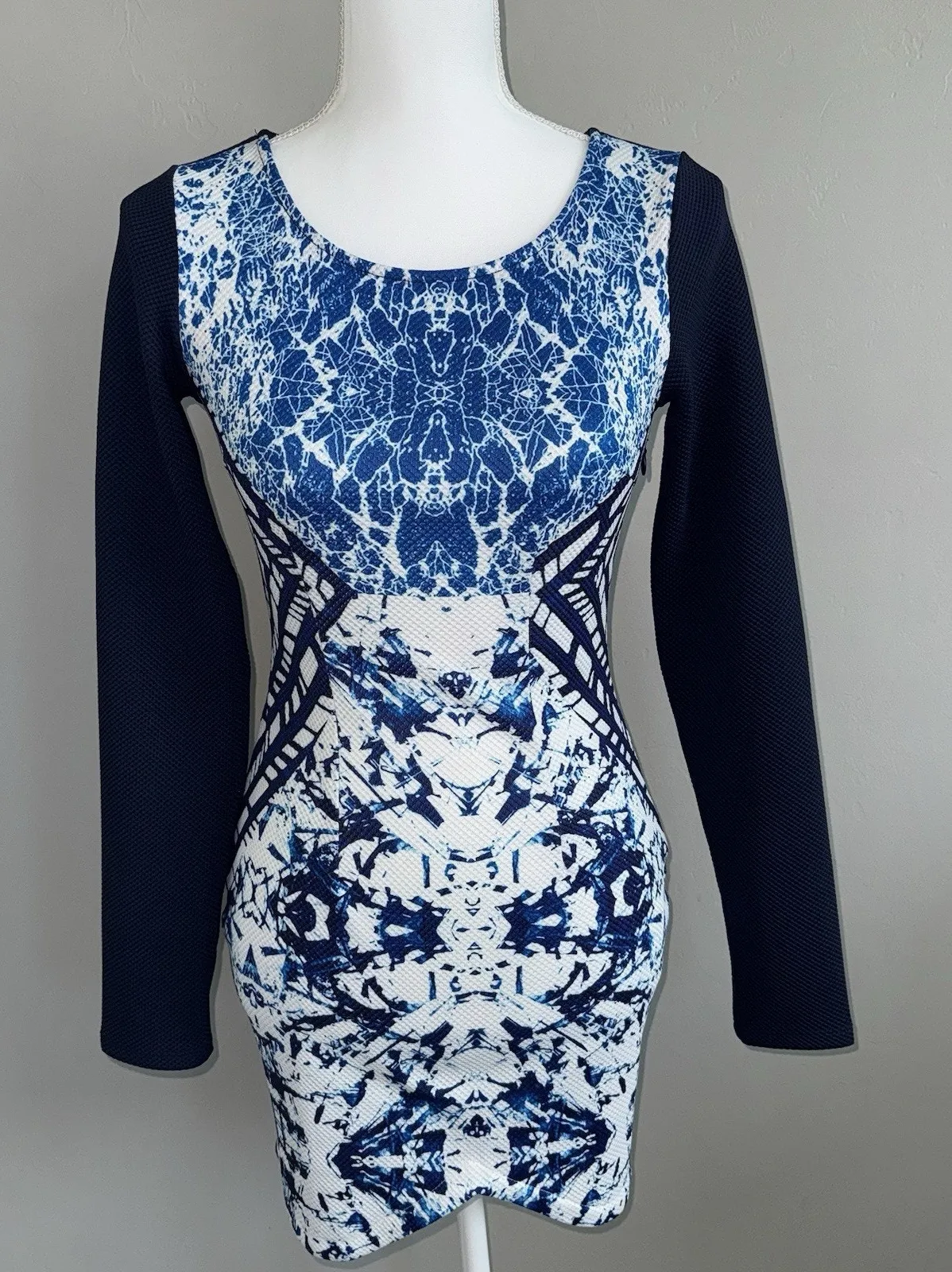 Beautiful woman’s long sleeve dress by Pepper Mayo. Navy blue in color with white watercolor abstract print on the front. Side zip closure, woman’s size 6 (pit to pit measures 15”). Asymmetrical hem, hits above the knee. Excellent preowned condition no flaws.