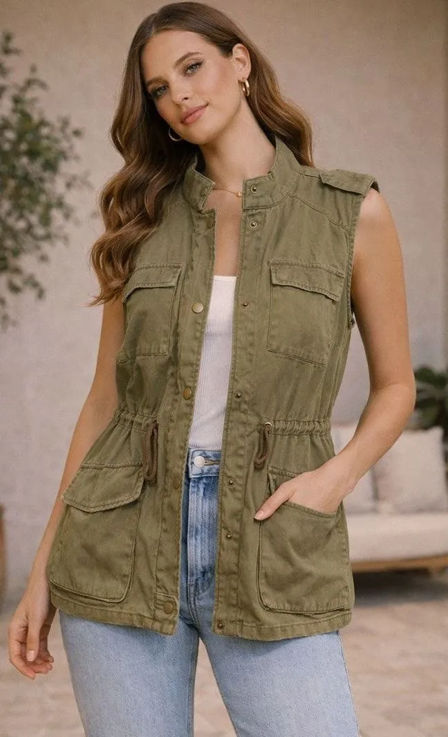 modern utility, earthcore, safari chic, boho casual, functional fashion, relaxed layering Versatile Per Se utility vest in an earthy green tone, designed with a structured yet relaxed silhouette that layers effortlessly. Featuring multiple cargo-style pockets, snap-button front, and an adjustable waist for a flattering fit, this sleeveless jacket blends function with modern style. A go-to layering piece for casual outfits, travel looks, or elevated boho-inspired wardrobes. • Brand: Per Se • Color: Green • Style: Utility vest / safari cargo jacket • Features: Sleeveless, snap-button front, multiple pockets, adjustable waist • Size: 1X