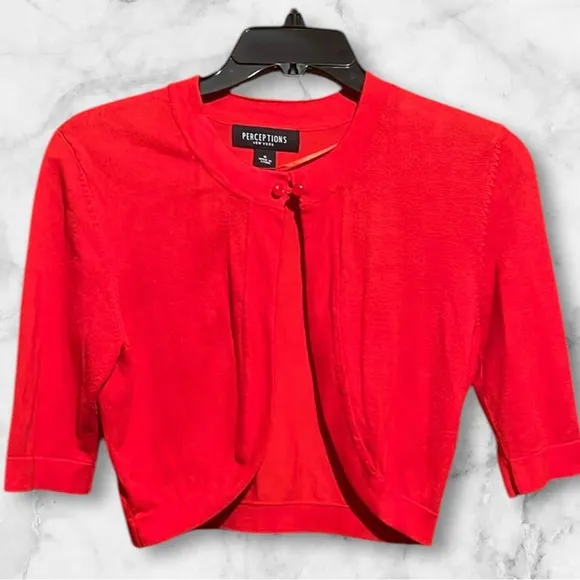 Vibrant red cropped cardigan by Perceptions. Features a 2 button closure and 3/4 sleeves. Great for that dress that needs a little extra coverage, or wear with a tee and jeans ! Anywhere you wear it this is versatile and really cute ! I ship same next day Thank you, April