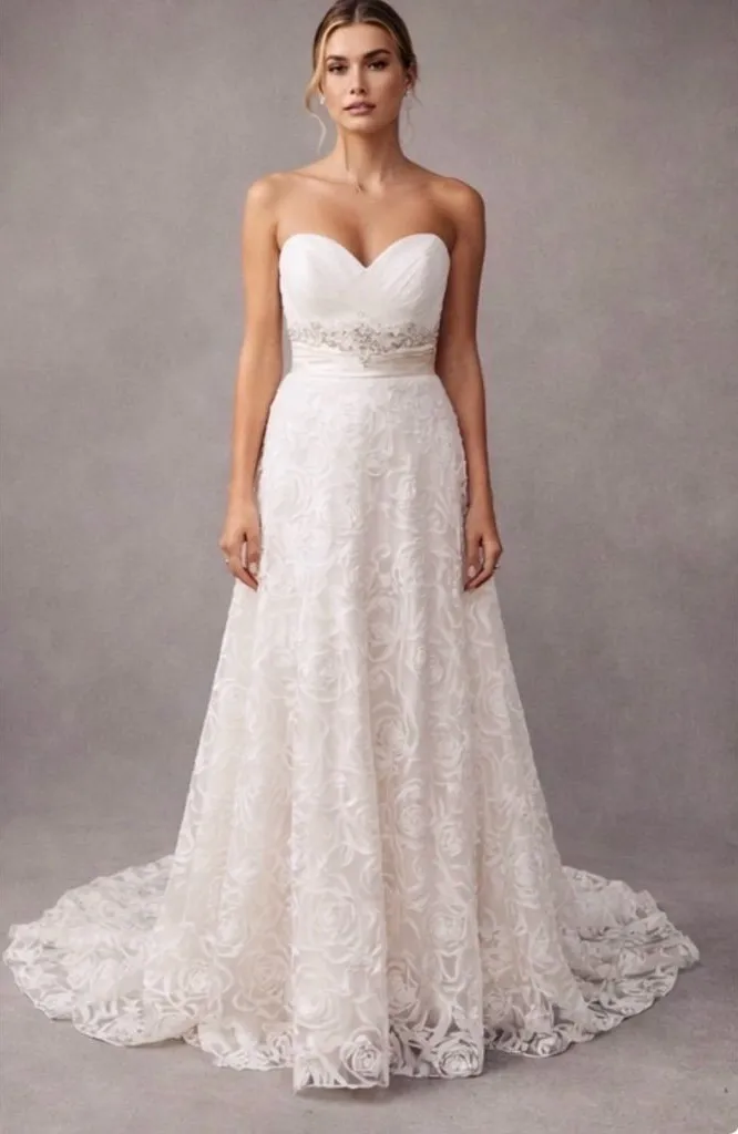 Casablanca Bridal 2048 Wedding Dress DESIGNER: CASABLANCA BRIDAL. Authentic Designer gown BRIDAL BOUTIQUE RETAIL: $2200 DETAILS: Soft Tulle over Silky Satin. Sweetheart neckline. Sparkling Swarovski crystals, rhinestone, and pearl beaded trim surround the ruched waistline to a zip back with faceted crystal button & loop accents. Romantic A-Line skirt & Garden length train boast appliqued rosettes thruoughout. Quality inner construction includes boning for a secure, flattering fit. Fully Lined. CONDITION: New without tags. Was been tried on a few times, but never worn down the aisle. MEASUREMENTS: Please see the standardized measurements from the designer's chart. COLOR: Light Ivory EMBELLISHMENT: Delicate bugle beads accent the empire seam. Tag has been removed but this is a 2017 bridal dress, gorgeous and in excellent condition. Please see measurements as size tag is not present, but according to size guide it mostly closely represents a size 8. Bust: 34” Waist: 28” Hips: 39” Soft Tulle over Silky Satin with 3D Soft Tulle flowers and Swarovski crystals, rhinestone, and pearl beaded trim finished with a rolled hem. Pleated Tulle sweetheart bodice is accented with a ruched band and crystal buttons on zipper. Silhouette:A-Line Neckline:Sweetheart