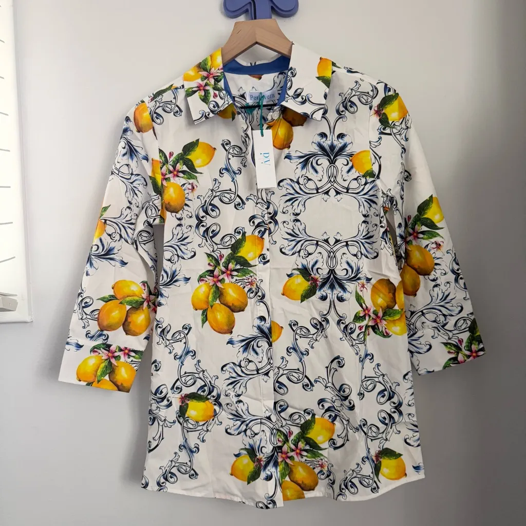 Perlavera XS NEW Lemon Print Button Up Long Sleeve Shirt Spring Preppy White Yellow - $50 New With Tags - From Most