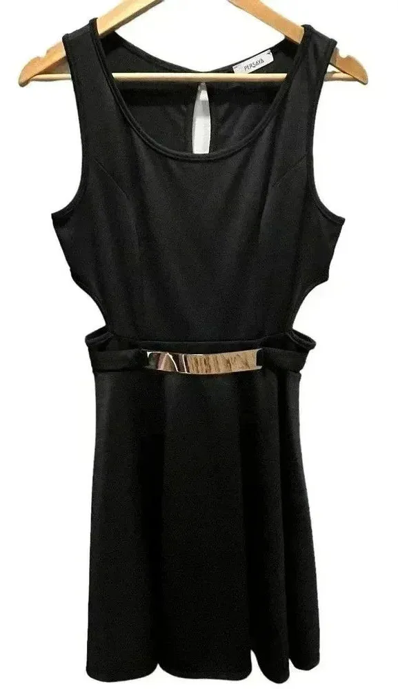 Persaya Black Sleeveless Side Cut-out Fit and Flare USA Made Dress Medium. 95% Polyester, 5% Spandex. Perfect for a night out on the town! Ships out in 1-2 business days This is a pre-owned item with normal signs of wear. Good-used condition, no rips, tears, or stains. Size: Medium Chest: 16 Length: 36 Measurements are in inches and approximate. Chest is measured from pit to pit.