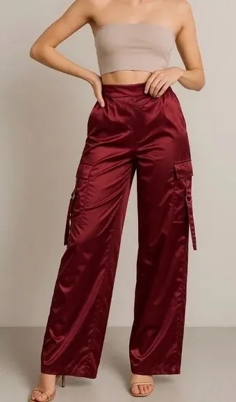 Brand: Persaya Color: Burgundy, brown, rust Size: XL Condition: Excellent pre-loved condition; no major flaws! Persaya women’s satin cargo pants in a deep burgundy red. These high-waisted wide-leg pants feature side flap pockets, pull on styling, D-ring strap detailing, and a sleek, silky finish that catches the light beautifully. Pull-on elastic waistband for a comfortable fit. Perfect statement piece for fall or the holidays • Color: Burgundy Red • Material: 95% Polyester, 5% Spandex • Style: Satin Cargo Pants / Wide Leg • Features: Elastic waist, flap pockets, strap details, luxe sheen finish Measurements (approximate, taken laid flat) Waist: 15.5’’ Length: 43.5’’ Inseam: 30’’ Rise: 14’’ All orders shipped same or next business day! Offers welcome :)