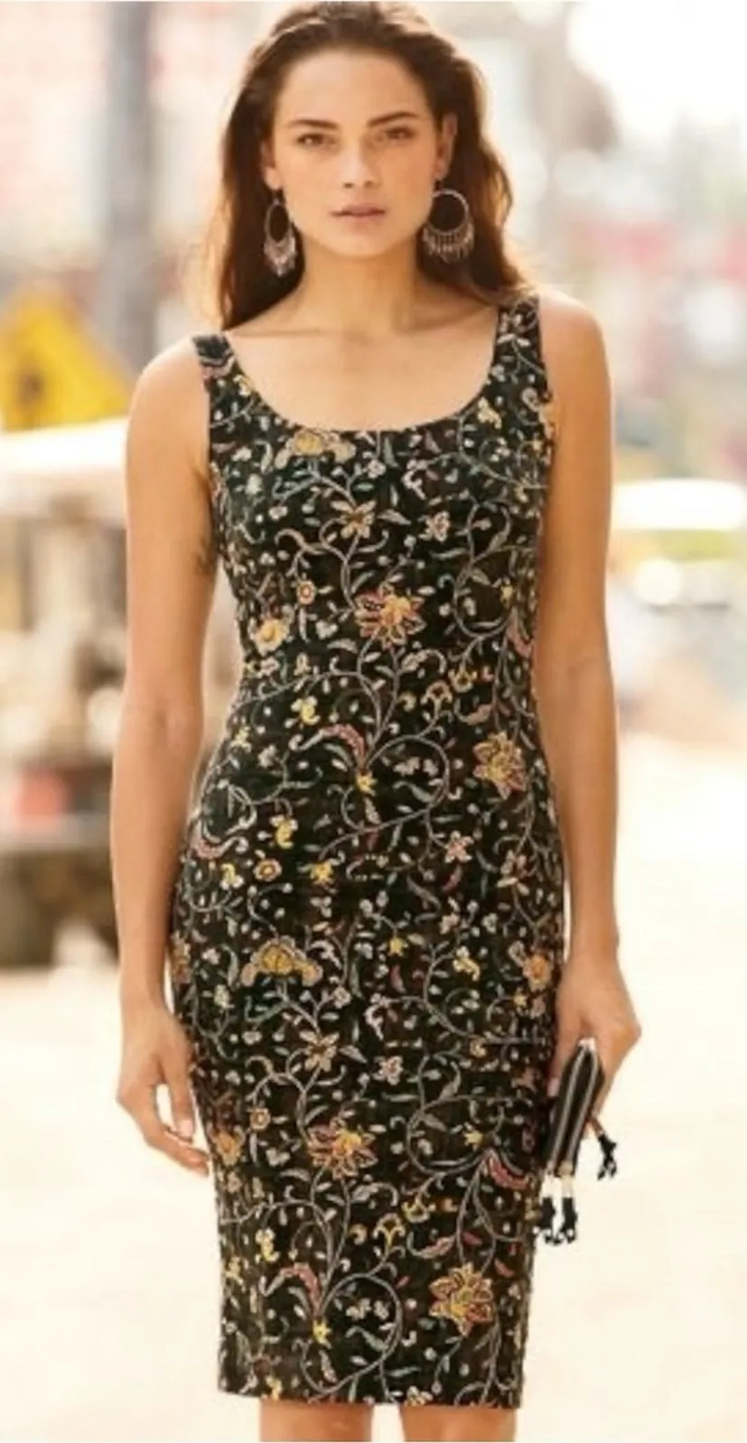 Peruvian Connection Artemis Pima Cotton Sheath Dress in Meadow Size XL Laying Flat / Approximately Armpit to Armpit 20.5” not Stretched Waist 18” Shoulder to hem 40” Excellent Preowned Condition Petite wildflowers from a Dutch tapestry are sprinkled across the sultry black jersey sheath. The substantial, double-layer silhouette in pima (94%) and Lycra® (6%) has a scoop neck front and back.