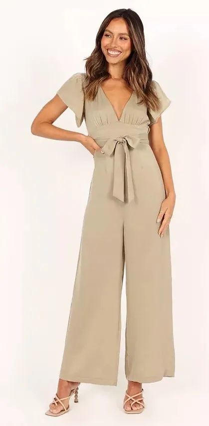 It features a stylish short sleeve design with a unique bow back detail, adding a touch of boho chic to your look. The beautiful olive green color is versatile and perfect for any occasion. v neckline short relaxed sleeves back invisible zip open back with neck tie close belt loops *does not come with waist tie wide leg pant partially lined Material 100% polyester This jumpsuit is new with tags and ready to wear. Size 6. Don't miss out on this must-have piece!