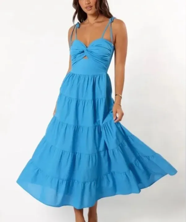 Brand new, never worn. Hidden back zip closure. Thin adjustable tie straps. Cut out feature under bust. 100% cotton. Pit to pit: 14-14.5” Waist: 13.5” Length (back zipper to hem): 41”