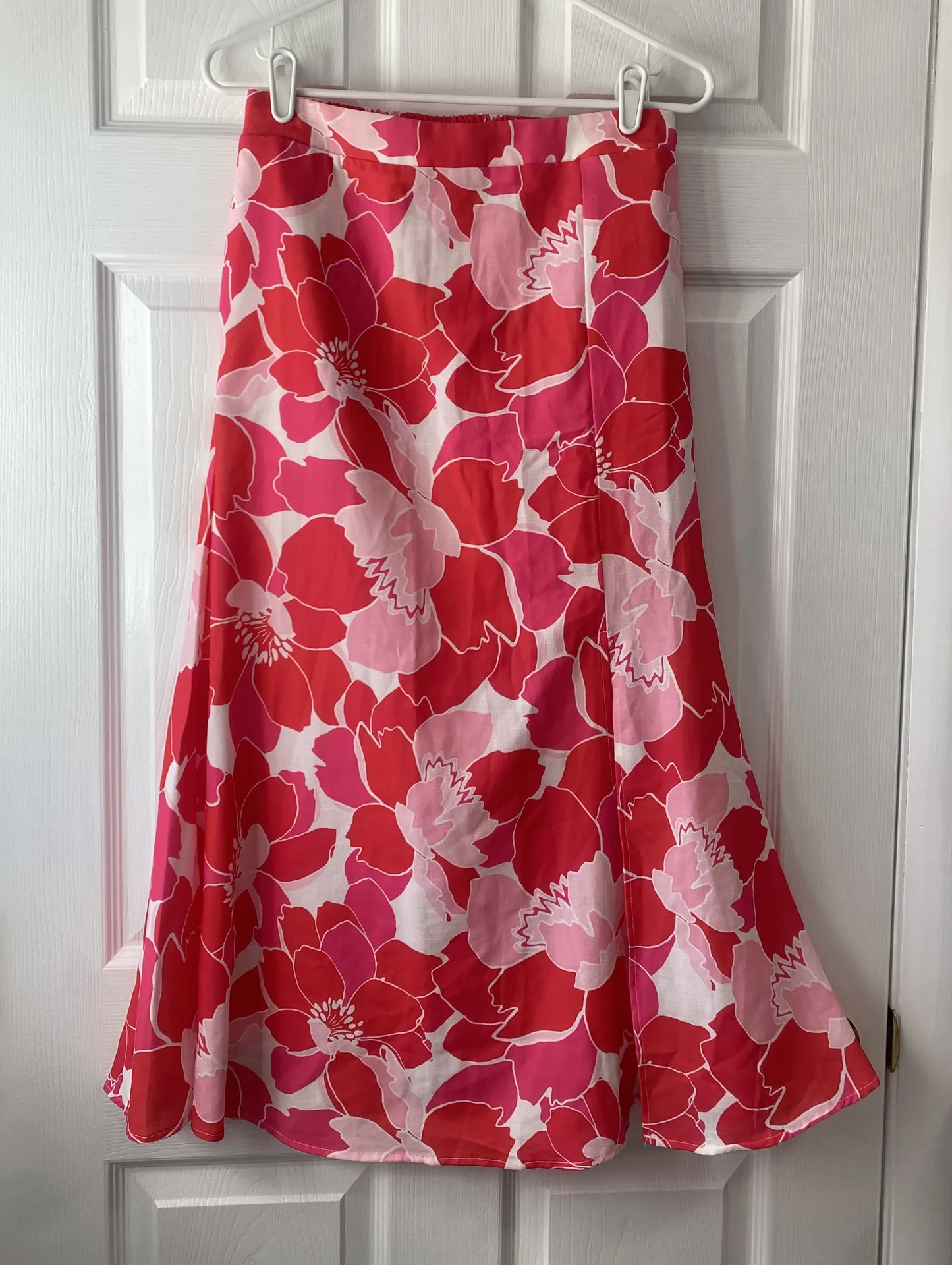 Excellent condition Size: M Length: 34inches Waist: 14inches Elastic back of the waist Two pockets Slit on the front White,red, and pink floral print Semi see through Midi/maxi length