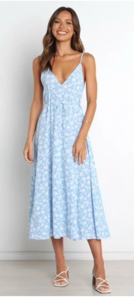 Petal & Pup Light Blue White Floral V-Neck Lightweight Midi Dress Size 4 Small Brand: Petal & Pup Size: 4 Condition: pre-loved ; does not include the sash for waist Material: polyester floral pattern not lined adjustable spaghetti straps plunge v-neck midi length low v back machine washable $74 original retail style name: Laguna keep it flowy & wear as is or throw on a belt/sash from another dress you own for a more defined waist fit Measurements laying down: Chest (pit to pit): 17" Length (shoulder to hem): 48" Product ID 7-0375-0925