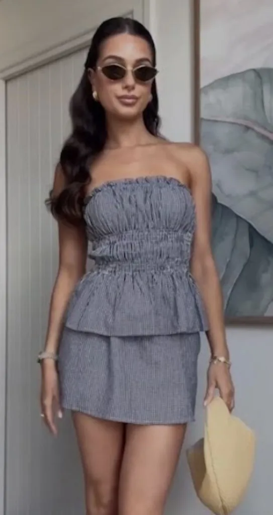 Details: – Includes top and skirt – Top has square neck; strapless – Skirt has elastic waist; on-seam pockets – Partially lined Composition + Care: – 100% cotton – Hand wash, dry flat Condition: – Excellent like-new condition Size and Color: – Size: Large – Color: Black White Gingham SKU # 11,560
