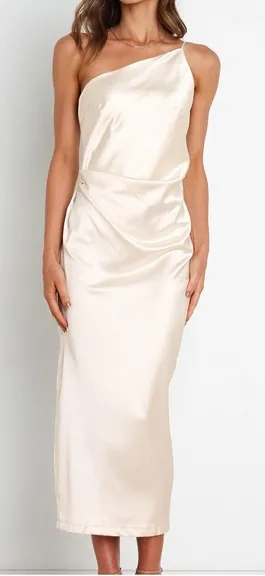 NEW WITH OUT TAGS- small flaw- Light snag - see photo- is not very noticeable- pp2 size women's 10 / MEDIUM pearl white one shoulder, ruched, silky , flowy fabric would be a great simple wedding dress DETAILS AND SIZE CHART IN PHOTOS CREATE A BUNDLE FOR COMBINED SHIPPING PAIR WITH ACCESSORIES OR UNDERGARMENTS ITEMS SHIP MON-FRI AT 9AM NEW LISTINGS DAILY MOST ITEMS ARE NEW OVERSTOCK DIRECT FROM MAJOR DEPARMENT STORES nordstrom, bloomingdales, silky, satin, cocktail party, maxi, social, brunch, special occasion, women's clothing, semi formal, wedding party, long flowy, vtg 20s 30s , fairy, whimsy, evening gown dress ,