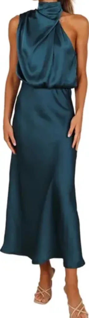 NEW WITH TAGS PLEASE NOTE THAT I HAVE A DIFFERENT SIZE IN PHOTOS BUT THIS IS THE SAME STYLE DRESS- THE DRESS IN PHOTOS IS A SIZE LARGE BUT THE LISTING IS FOR A SIZE SMALL 2 avialable in size small- would make a great bridesmaid dress that could be worn again for any special occasion PP4 SIZE US S This Petal & Pup midi dress is crafted from smooth satin with a defined waist. It features a high neck, asymmetric cutaway shoulders, and is sleeveless. It has a hidden back zip closure, a keyhole with button-and-loop closure, and is partially lined. It is made of 95% polyester and 5% elastane. Material 95% Polyester, 5% Elastane Care Instructions Hand Wash, Line Dry Sleeve Sleeveless Origin Imported Lining Partially Lined Closure Hidden Back Zip; Keyhole With Button-And-Loop Closure Neckline Mock Neck Brand PETAL & PUP Color teal hoco, home coming, midi length, draped style, silky, women's dresses, nordstrom, solid, green teal, wedding party, bridesmaid, formal, midi, high neck, classic, minimalist,