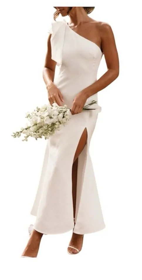 This elegant one-shoulder dress is perfect for any special occasion. The sleek white design offers a timeless and sophisticated look. New with out tags Size:large Length 52” ✎ comment it you have any questions? SMOKE FREE & PET FREE HOME Offers welcome! All orders ship 1-3 business days!
