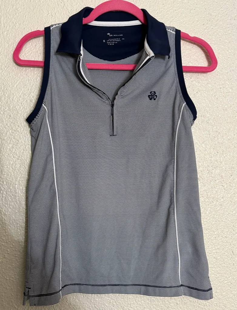 Peter Millar size small navy and white stripe sleeves tank shirt top in very good condition. In great condition Tag peeling and has a tiny tag hole pictured Erin Hills Logo 92% polyester 8 % Spandex This Peter Millar women's sleeveless tank is a perfect addition to your golf wardrobe. The shirt features the Erin Hills logo to show off your love for the sport. Made specifically for women, this shirt is designed to offer maximum comfort and freedom of movement during your game. It is an ideal choice for golfers who are looking for a stylish and functional shirt to wear on the course. The shirt is made of high-quality materials and is designed to last for a long time.
