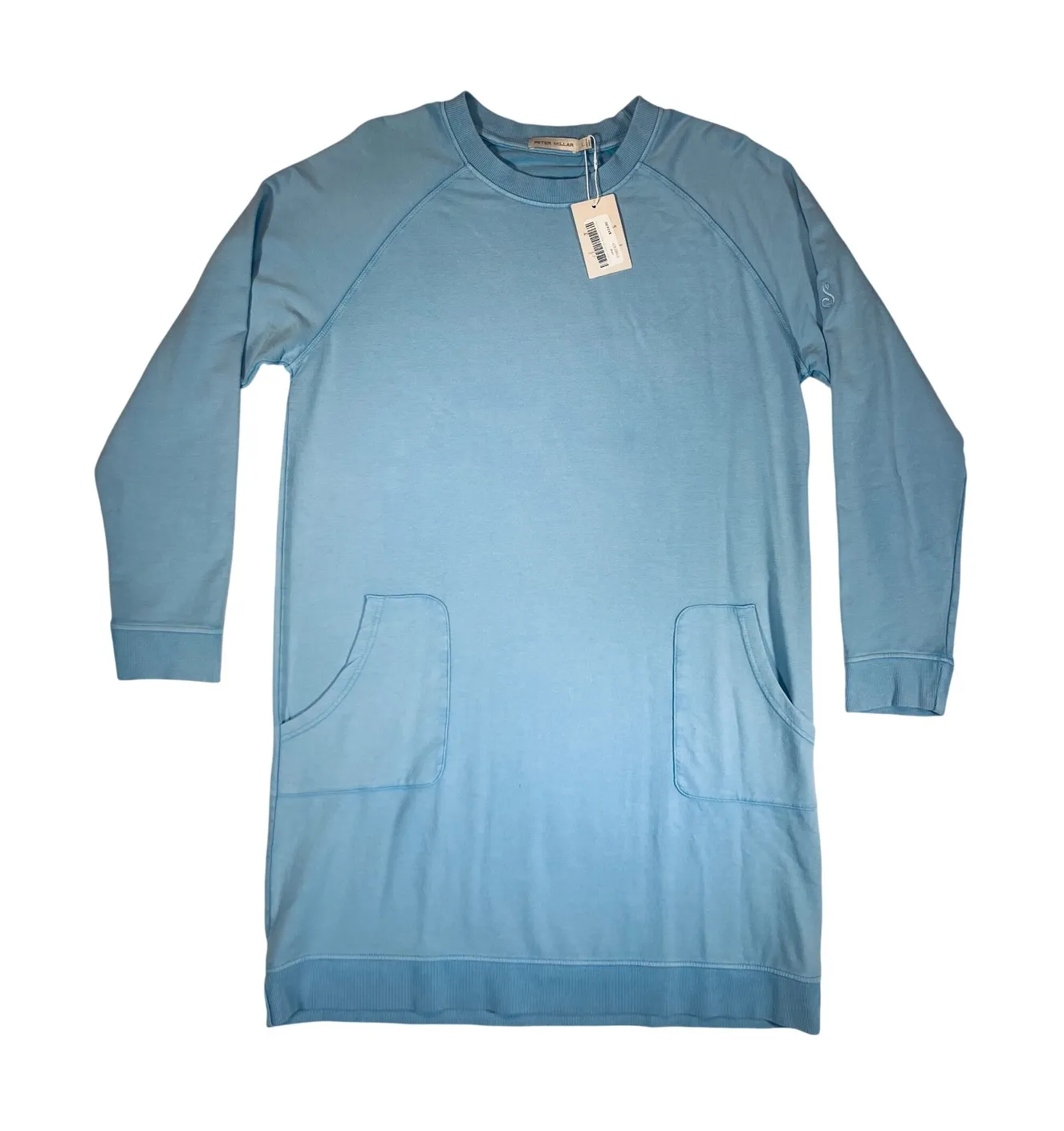 A Peter Millar women's light blue sweatshirt dress. This casual and comfortable dress features a classic crew neck, long raglan sleeves, and two convenient front pockets. The hem and cuffs are ribbed for a classic sweatshirt look. Perfect for a relaxed weekend outing or a casual day at home. Style: Sweater Dress, T-Shirt Dress Dress Length: Midi Department: Women Sleeve Length: Long Sleeve Pattern: Solid Occasion: Casual Material: Cotton Blend Fabric Type: Knit Neckline: Crew Neck Season: Fall, Winter Sleeve Type: Raglan Sleeve Closure: Pullover Accents: Embroidered, Pockets Features: Pockets Keywords: Peter Millar, sweatshirt dress, light blue, crew neck, long sleeve, pockets, casual, loungewear, athleisure, pullover, comfortable, everyday, fall fashion, winter wear
