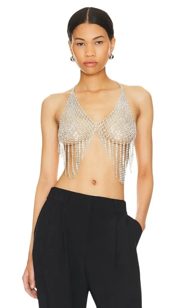 This dazzling halter crop top crafted from shimmering crystal rhinestones exudes elegance and boldness in equal measure. Its intricate fringe detail and backless design create a captivating silhouette, making it a standout choice for festive occasions or glamorous evenings. Adjustable for comfort, it seamlessly blends artistry and versatility with radiant allure. Zinc & zircon Spot clean only Halterneck and back lobster clasp closure Rhinestone embellishments throughout with fringe hem Revolve Style No. PETM-WL470 Manufacturer Style No. YC224 Color: Silver MSRP: $150 Features: • Totally Sold out on Revolve! Size: Womens OS Condition: New Without Tags No tags at all tags: chunky, unisex, chain, crystal, rhinestone, fancy, elegant, feminine, beach, pearls