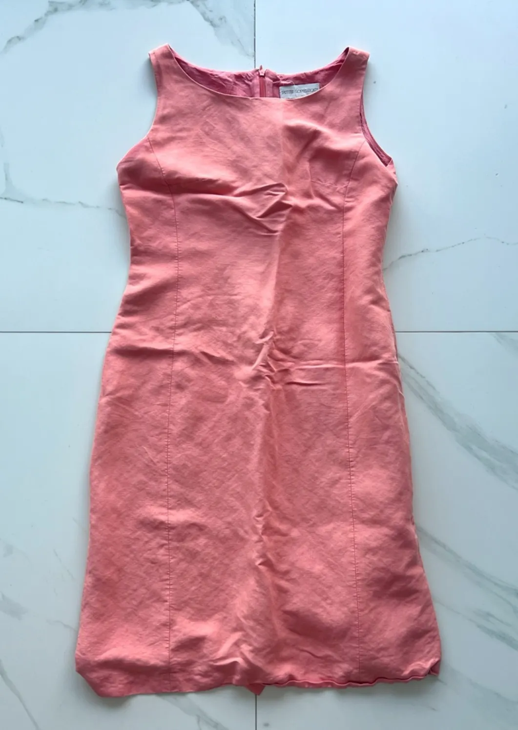 MSRP $60. Pink orange dress from Petite Sophisticate. Scoop neck, sleeveless, sheath form, lightweight linen blend, concealed back zipper, fully lined, hits below knees midi. Breezy style. π Size 4: bust 34β, waist 30β, hips 36β, length 37β π Condition: good - light wear and pilling throughout, light marks under armpits and general fading throughout as shown in photos π Material: feels like a linen blend good - light wear and pilling throughout, light marks under armpits and general fading throughout as shown in photos