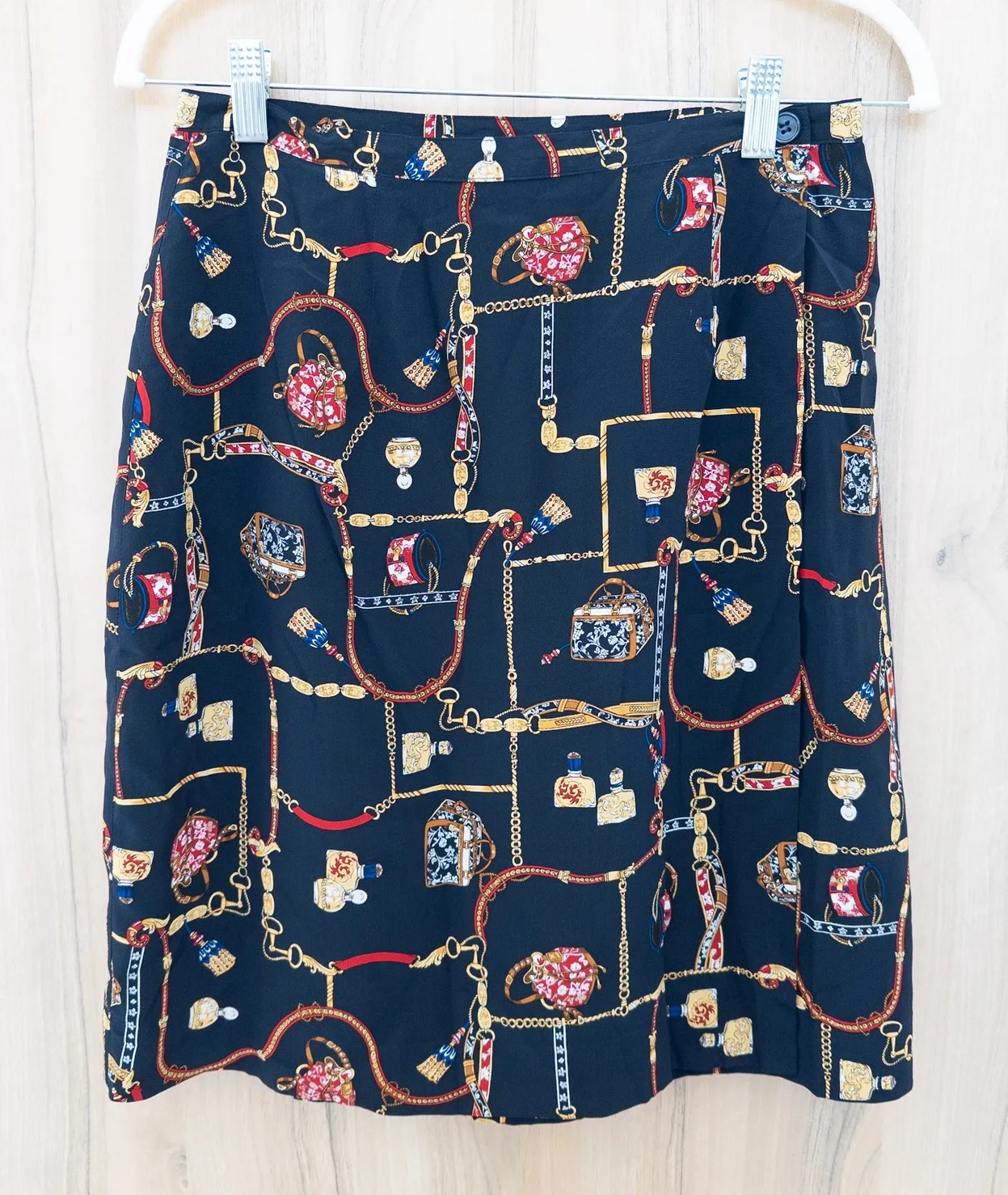 • 100% silk shell • Lined • Classic chain-and-jewels print • Back zip closure • Knee length silk, quiet luxury, vintage chic, retro, classic, elegant, academia, artsy, preppy, timeless Approximate measurements, flat lay: Waist: 14" Length: 21" Ships next business day. Bundle deals available. Smoke-free home. Please check measurements before purchasing. SKU 3402