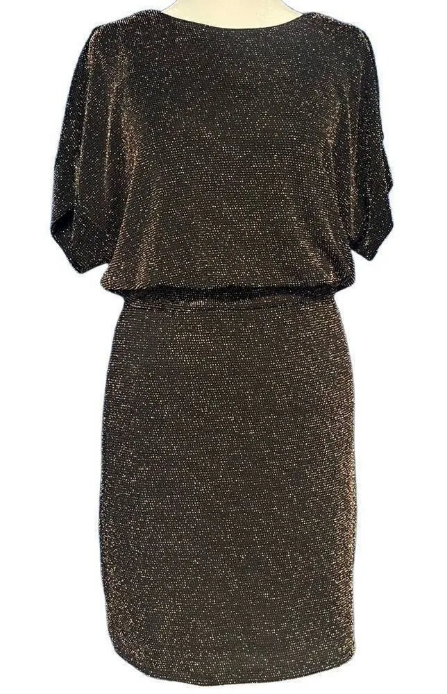 Capture the spotlight in this stunning Peyton Jensen dress, a shimmering masterpiece ready to elevate your evening style. Crafted to flatter, the dress features a comfortable elasticized waist that gently cinches, leading to a sleek, figure-hugging pencil skirt that accentuates your curves. The relaxed, kimono-style sleeves provide an elegant drape, while the keyhole back adds a subtle touch of allure. Dazzle at cocktail parties, captivate at evening events, or make a memorable impression on a special night out. Style: Bodycon, Pencil Dress Dress Length: Knee Length Color: Black Department: Women Sleeve Length: Short Sleeve Pattern: Solid Occasion: Party/Cocktail Material: Nylon, Polyester, Spandex, Metallic Neckline: Round Neck Character: Sparkle, Glam, Evening, Party, Shimmer Fabric Type: Knit Keywords: metallic dress, gold dress, knit dress, bodycon dress, cocktail dress, party dress, evening dress, peyton jensen, small, kimono sleeve, keyhole back, sparkly dress, shimmer dress, date night dress