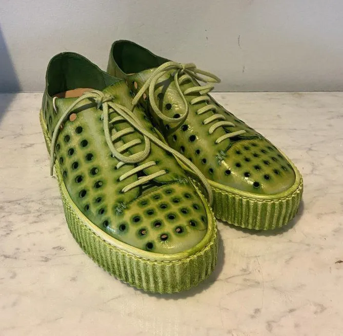 Brand: DF10 Style: Womens lace up leather platform sneakers with a bold perforated polka dot design. Color: Gradient green upper with darker green circular perforations and matching green ribbed platform sole. Size: Womens US 8.5, EU 39, UK 6, standard width. Branding: Embossed DF10 logo with dotted rectangle on the leather insole and made in Italy text. Material: Smooth leather upper with allover punched perforations, leather lining, and substantial molded platform outsole. Details: Round toe, lace up closure, ventilated perforations for breathable comfort, textured flatform sole for added height and style. Made in Italy construction and the vivid green polka dot pattern create a unique statement sneaker for fashion forward casual wear. Please review all photos and the condition notes for additional details about wear.