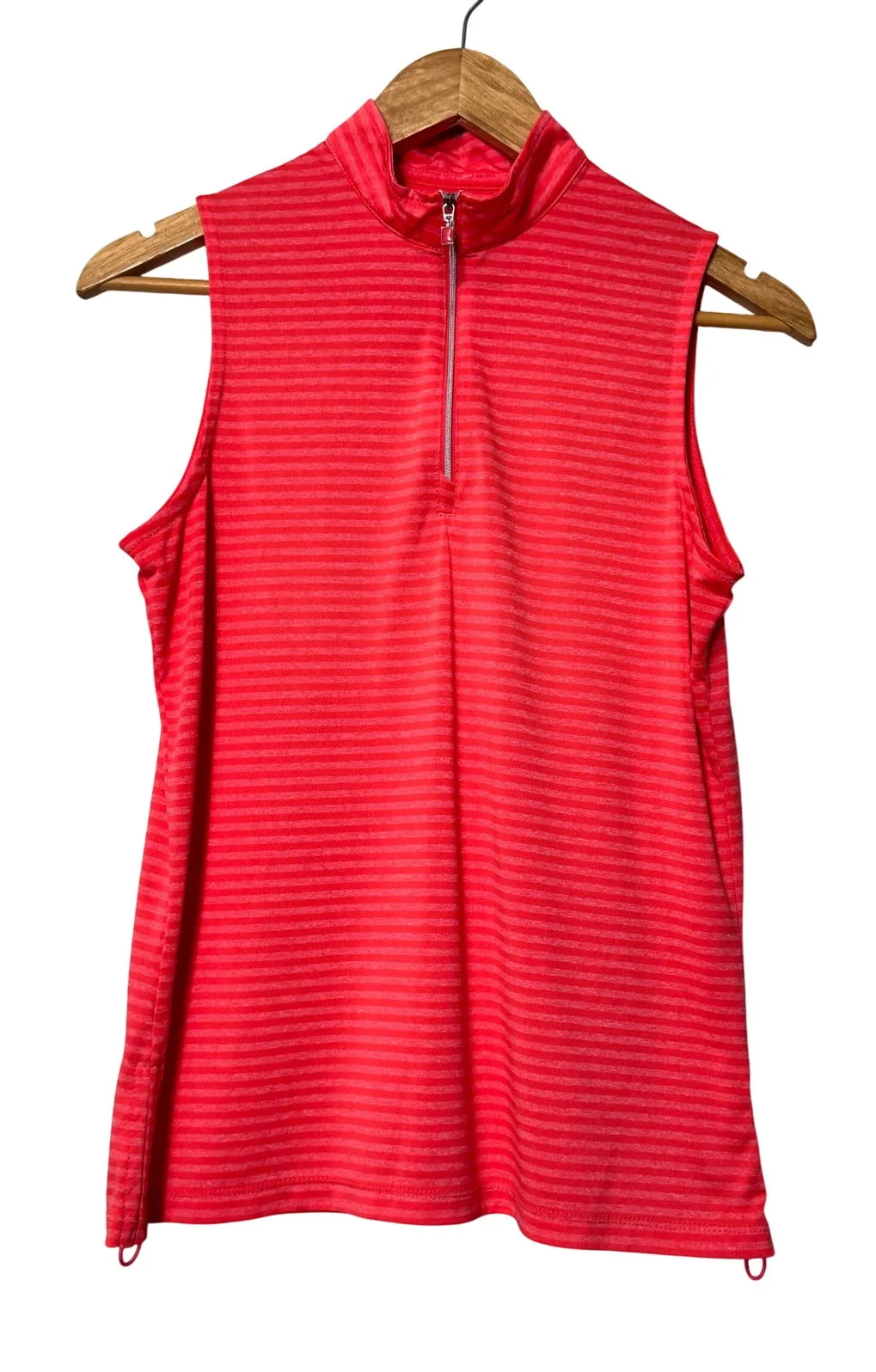 PGA TOUR women's sleeveless golf polo shirt in a vibrant coral with a subtle stripe pattern. This athletic top features a mock neck and a convenient quarter-zip front closure with a decorative pull tab. Designed for comfort and performance, it includes a subtle drawstring at the hem for an adjustable fit. Perfect for a day on the golf course, a casual outing, or an active vacation. Type: Polo Department: Women Sleeve Length: Sleeveless Product Line: Nike Golf Features: Breathable, Lightweight, Adjustable Performance/Activity: Golf Pattern: Striped Neckline: Mock Neck Material: 100% Polyester Style: Jersey Fit: Regular Closure: Zip Model: PGA TOUR Theme: Sports Fabric Type: Knit Accents: Zipper Keywords: golf, athletic, activewear, performance, sleeveless top, striped, quarter zip, mock neck, drawstring hem, sporty, tennis, workout, summer Reasonable offers always happily accepted