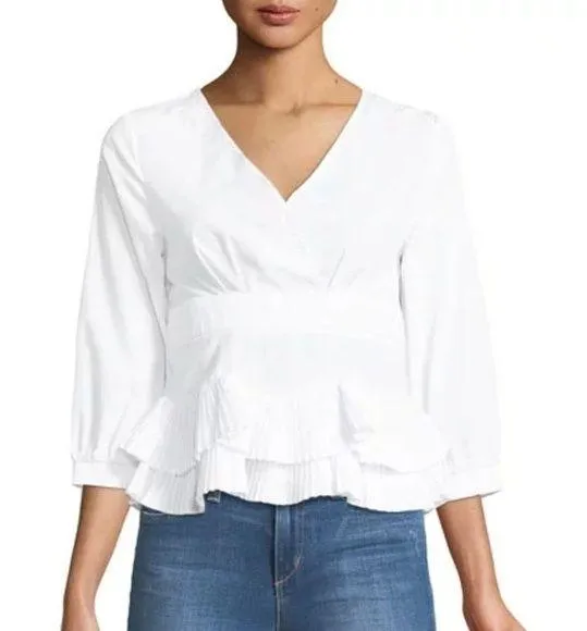 Free Generation wrap-front blouse in poplin. Brand new with tags. Gorgeous! V neckline. 3/4 sleeves; ribbed cuffs. Covered button-down back. Tiered, pleated peplum hem. Cotton/polyester. Hand wash. Bin25